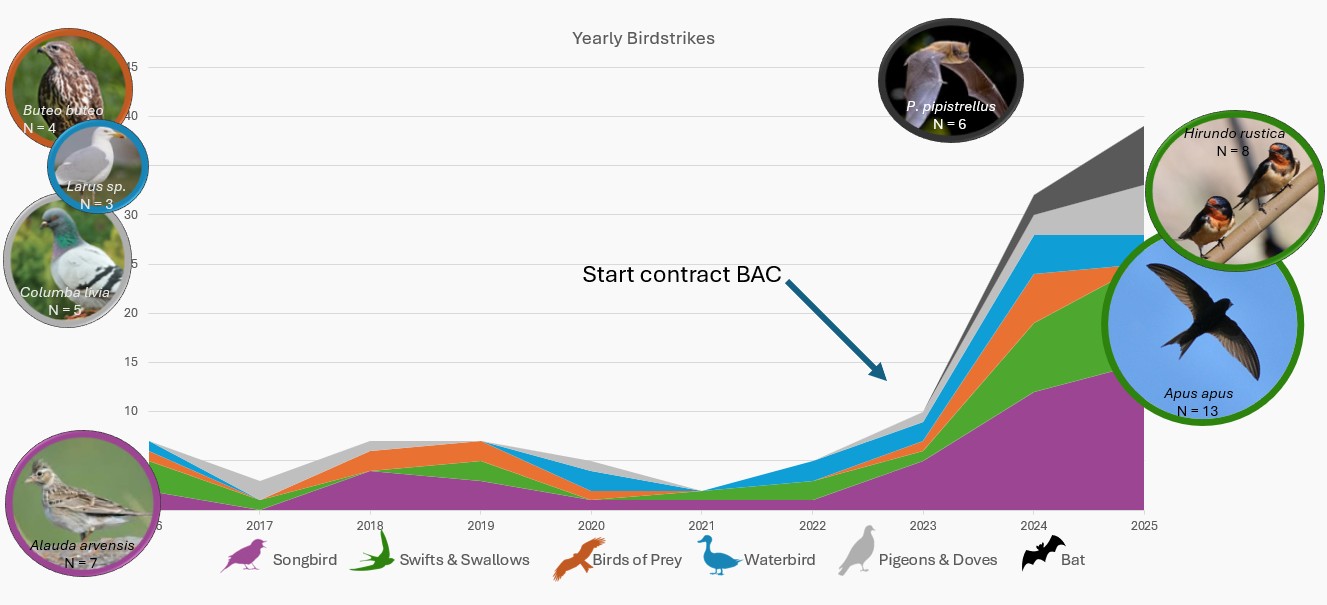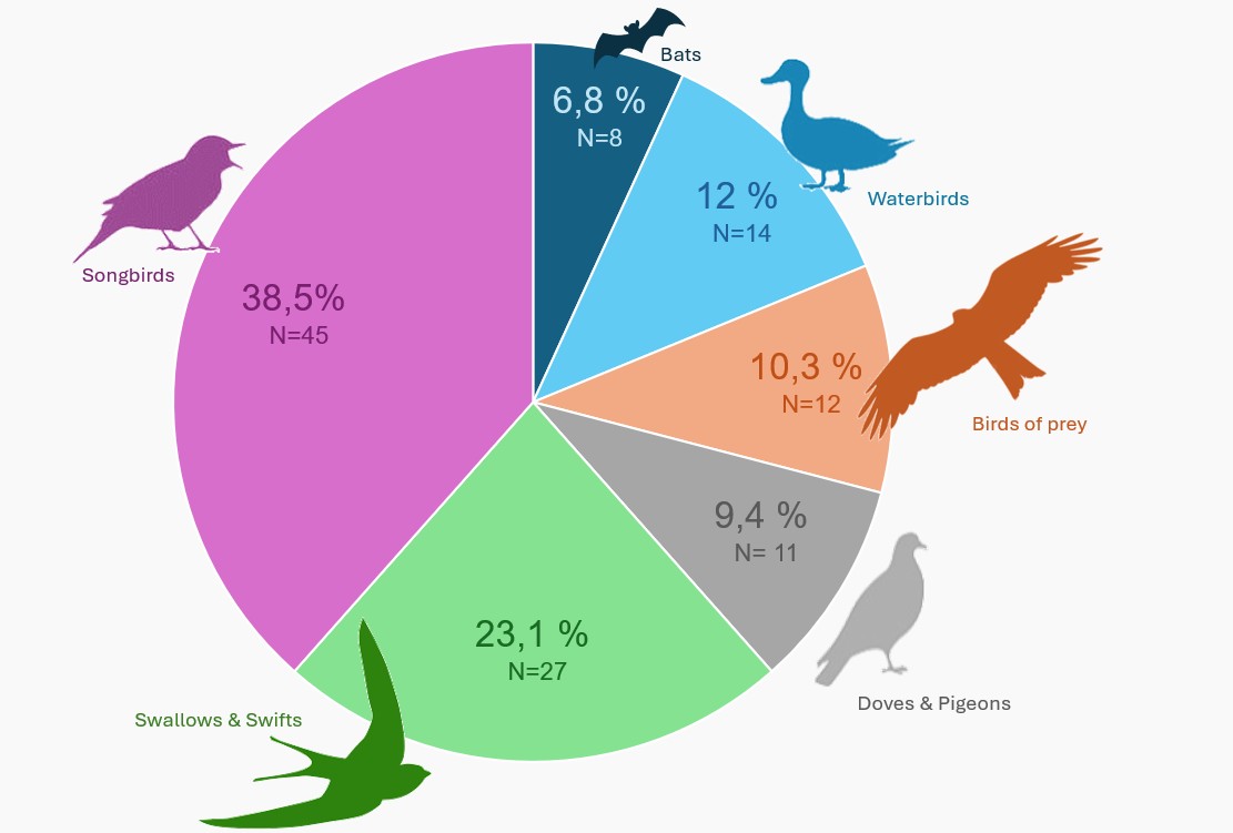Some birds often involved in these incidents include buzzards (such as Buteo buteo), swifts & swallows (such as Apus apus, Hirundo rustica), and songbirds (such as Alauda arvensis, Carduelis cannabina).